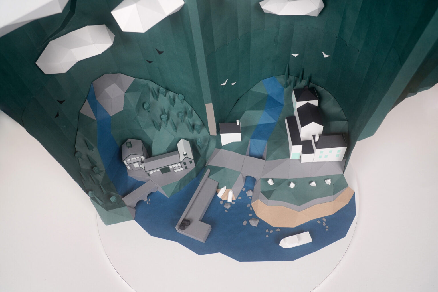 There are few more powerful demonstrations of this than the Message in a Wrap project. This two-year project celebrated the moulded fibre wrap James Cropper produced in collaboration with Bruichladdich whisky. In it, Nathan and James Cropper worked together to craft a stunning 3D diorama depicting James Cropper’s iconic Burneside mill alongside the picturesque Bruichladdich distillery, capturing the scene in paper and moulded fibre.